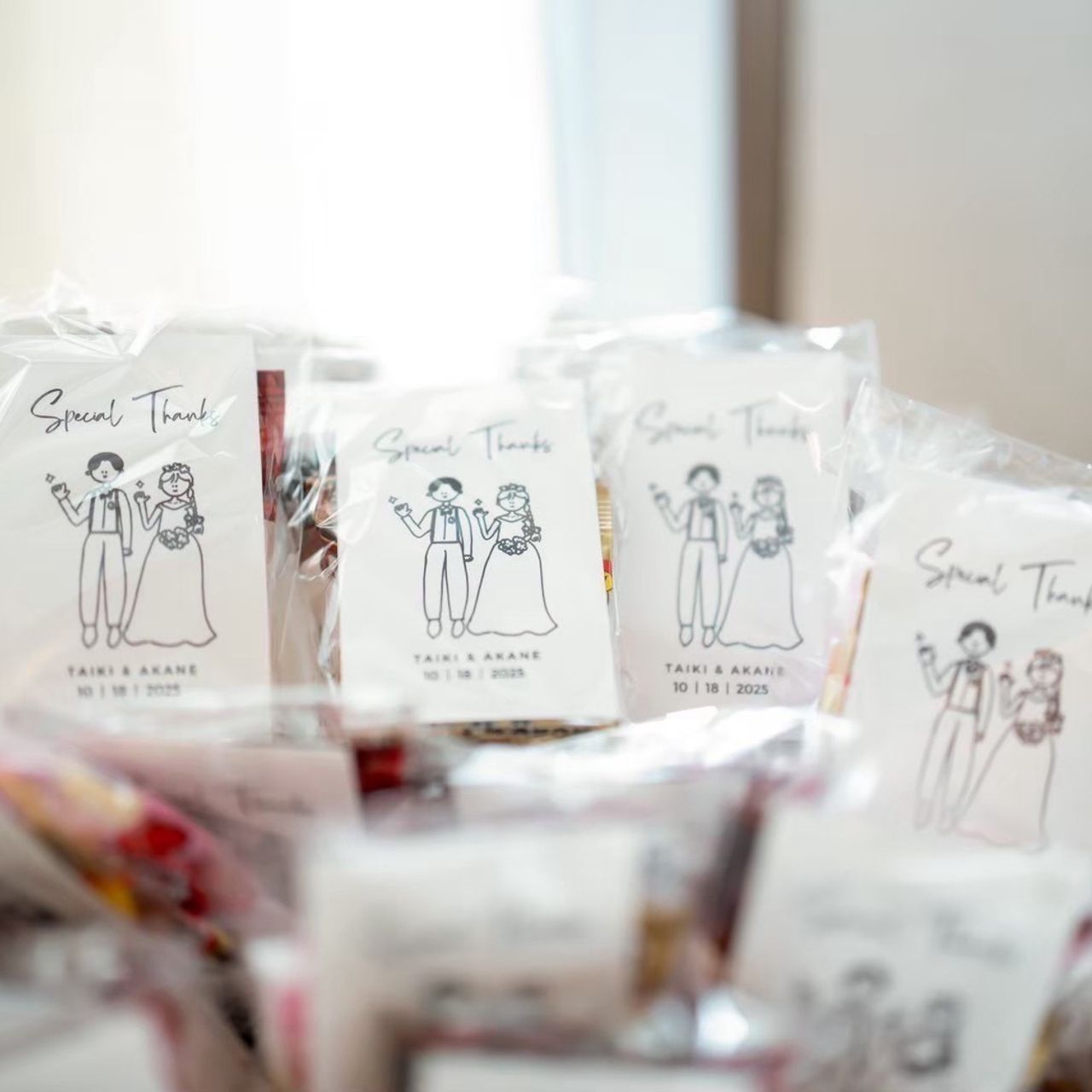 プチギフトは、クッキーやチョコレートなどの定番の甘いお菓子に加えて、お煎餅などのしょっぱい系のお菓子もお渡ししました。甘いものが苦手なゲストにも楽しんでいただけるよう、いくつか種類を用意しています。