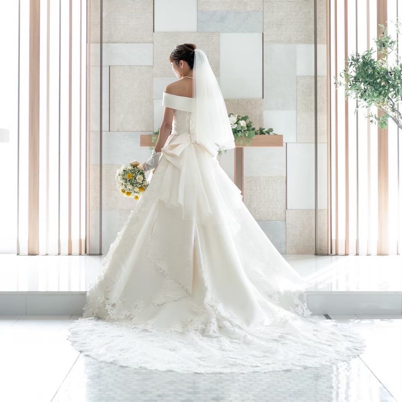フロントは上品で綺麗めなデザインになっており、無駄のないシルエットで大人っぽい雰囲気ですが、後ろには大きなリボンがあります。立体感のあるリボンが目を惹き、存在感がありつつも上品で、可愛すぎない絶妙なデザインです。トレーンに施された花の刺繍が歩くたびにふわっと揺れ、とても綺麗でした。