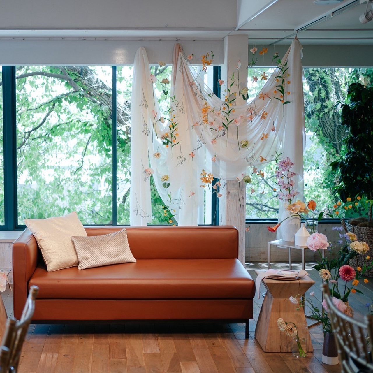 高砂後ろにはフラワーカーテンを施し、ナチュラルでかわいらしい雰囲気に仕上げています。