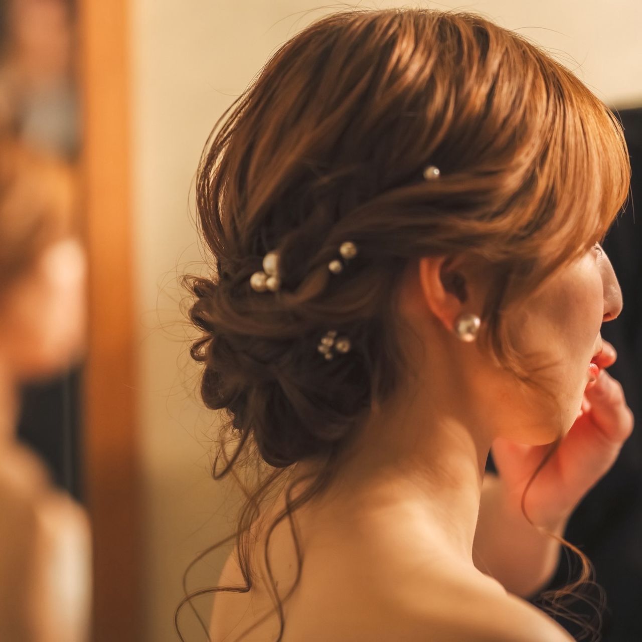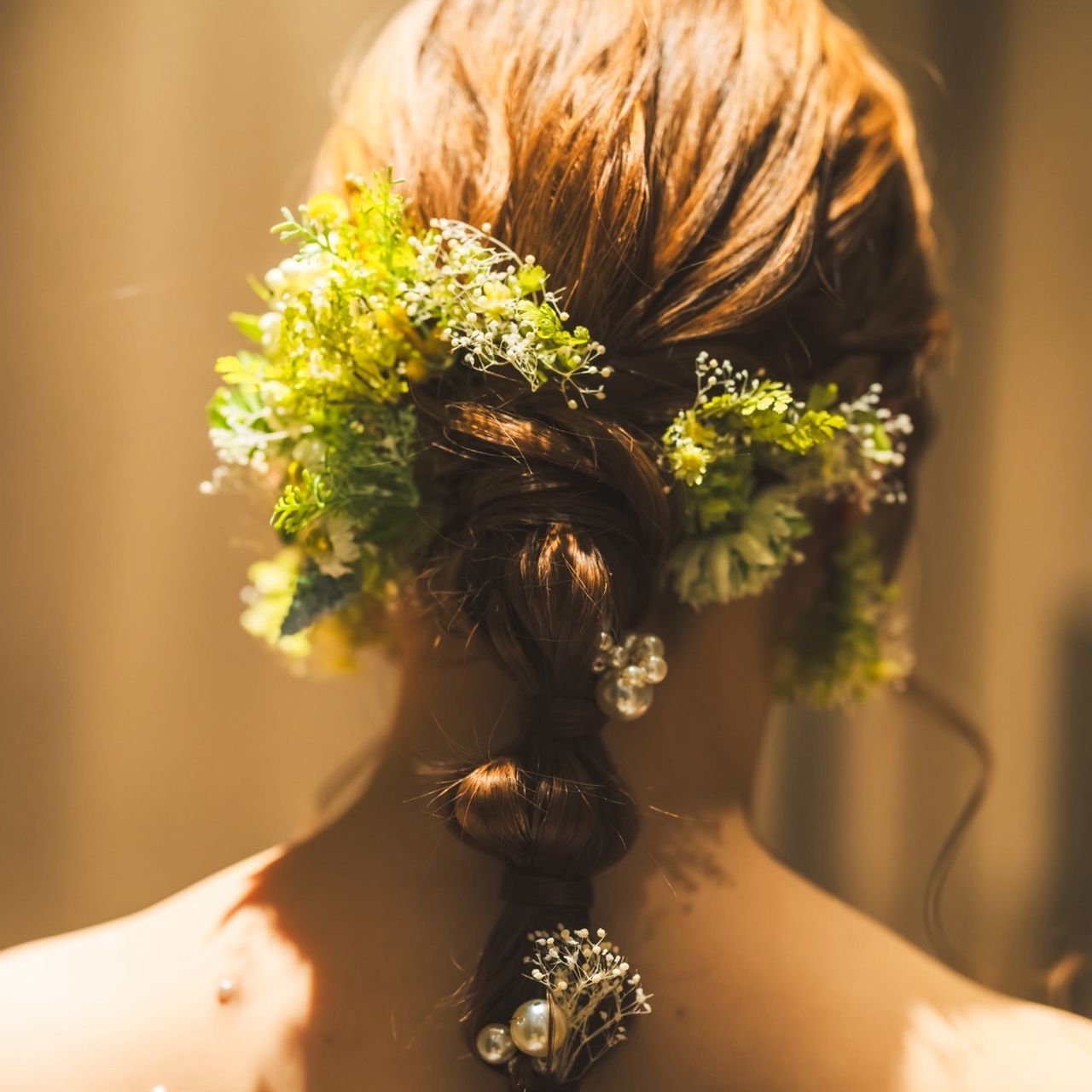 挙式ではSHEINで購入したパールのアクセサリー、披露宴入場ではドライフラワーと造花で自作したアクセサリー、披露宴の再入場ではSHEINで購入した蝶々とお花の髪飾りをつけました。
