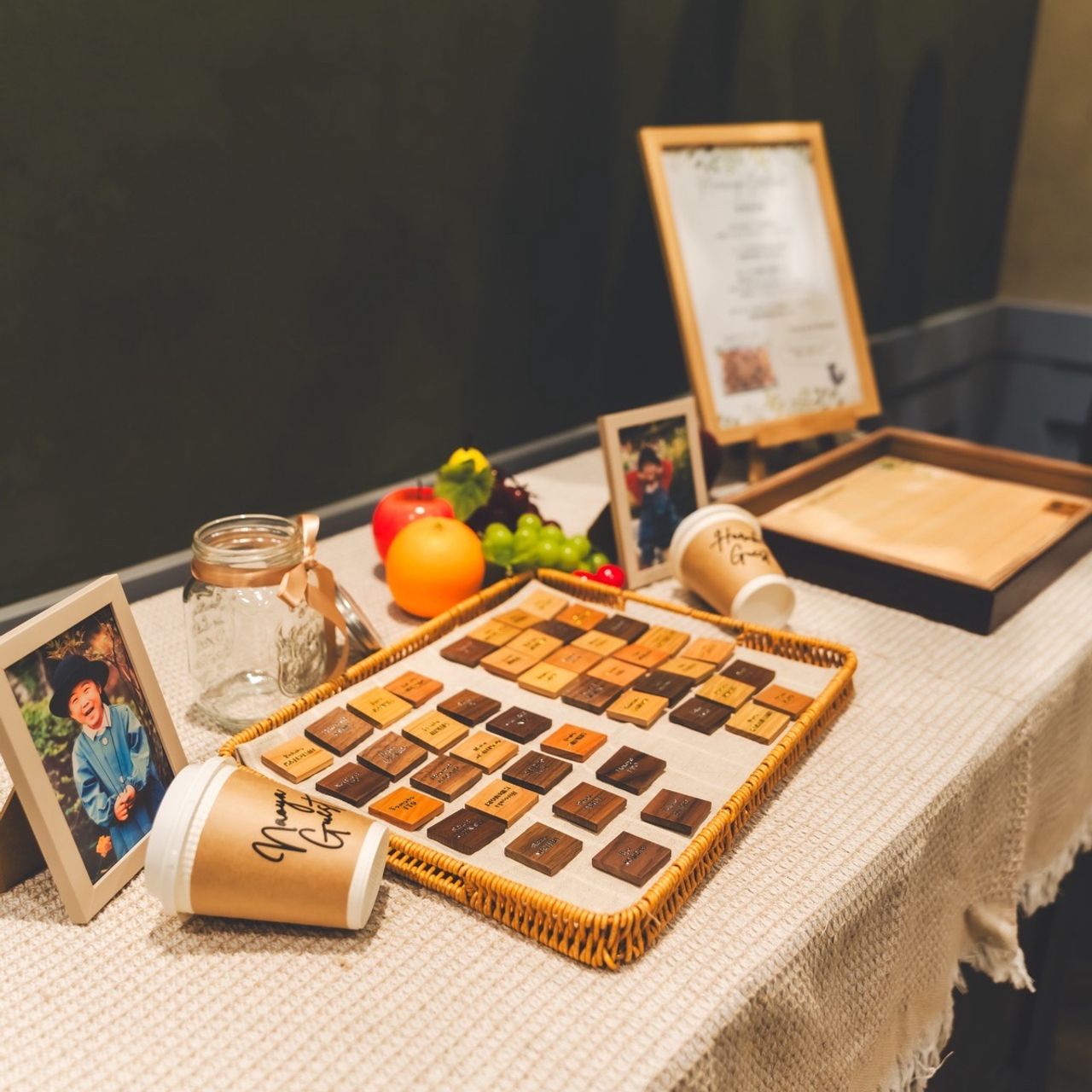 遠方から来る方が多かったので、全員ギフトカードにしました。好きな引出物・引菓子・縁起物を選べて、アップグレードできるものにしています。