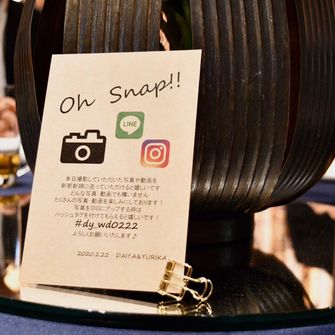 空間やインテリアは『和モダン』をコンセプトに。ネイビー&ゴールドをテーマカラーにして、統一感を意識しました!全体のテーマは『live,love,laugh』に。笑い声と愛の溢れる時間になるように考え、アットホームを意識しました。これは私たち夫婦の人生のテーマでもあります。