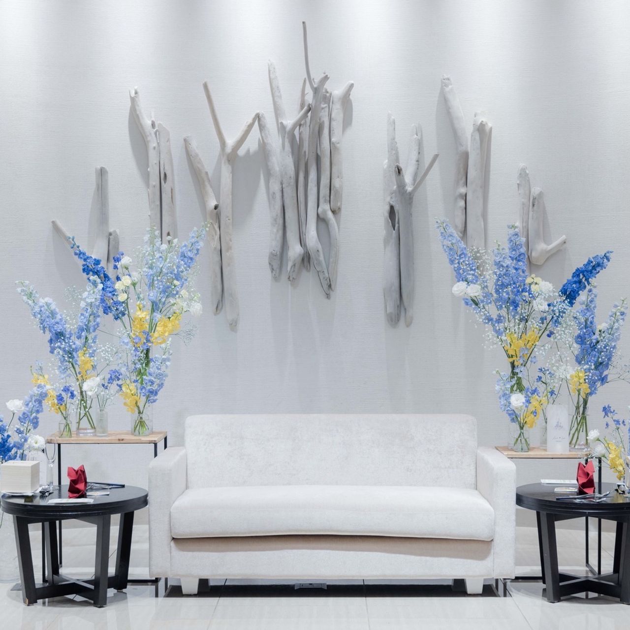 装花は、全体的なお花のボリュームやカラーは少なめに依頼して、シンプルで綺麗めにまとめてもらっています。ドレスや会場が鮮やかだったので、イメージ通りの会場セッティングになりました。