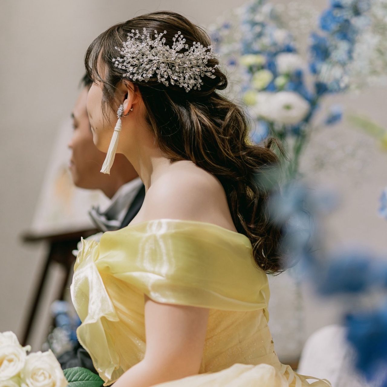先輩が購入したアクセサリーを借りて、持ち込みました。ウェディングドレスとカラードレスで、それぞれ使用しています。