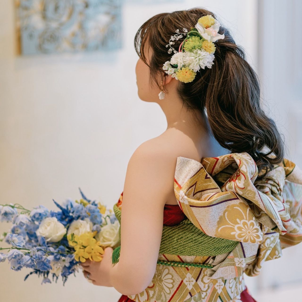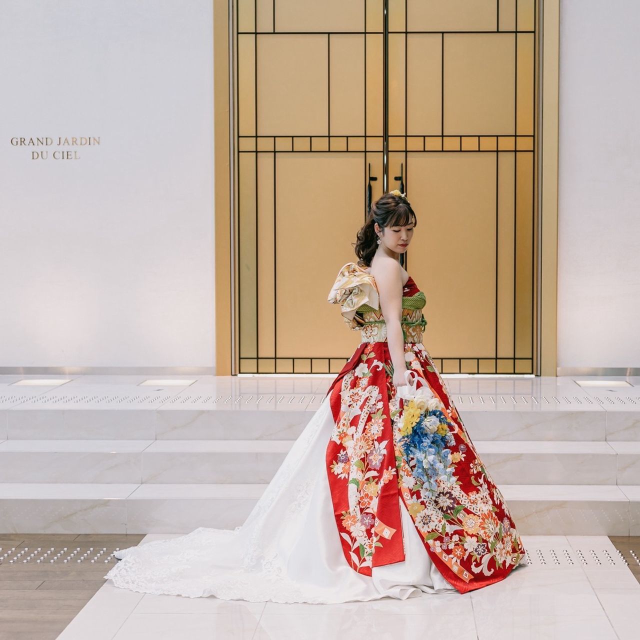 20歳の成人式の時に、おばあちゃんに買ってもらった振袖を、ウェディングドレスに巻き付けるオリエンタル和装にしました。オリエンタル和装をやりたかったので、この演出が可能だったことも、式場を決めたきっかけになりました!