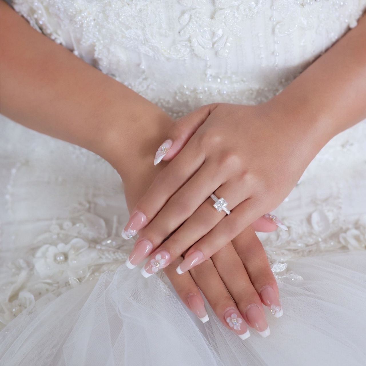 ネイルは、白のフレンチをベースに、3Dで白いお花のアートを施しました。お花の中央にはキラキラ輝くストーンをのせて、指先まで華やかに仕上げてもらっています。