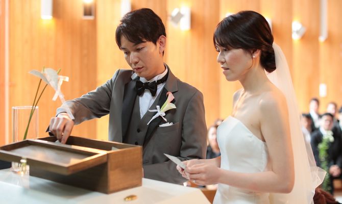 テーマは自分たちもゲストも気張らず、アットホームに楽しめる同窓会のような式です。木に囲まれた幻想的なチャペル、温かい雰囲気の披露宴会場に一目惚れしました。また、鶴見ノ森 迎賓館は1日2組のみの案内でかなり自由度が高いことも決め手になりました♡