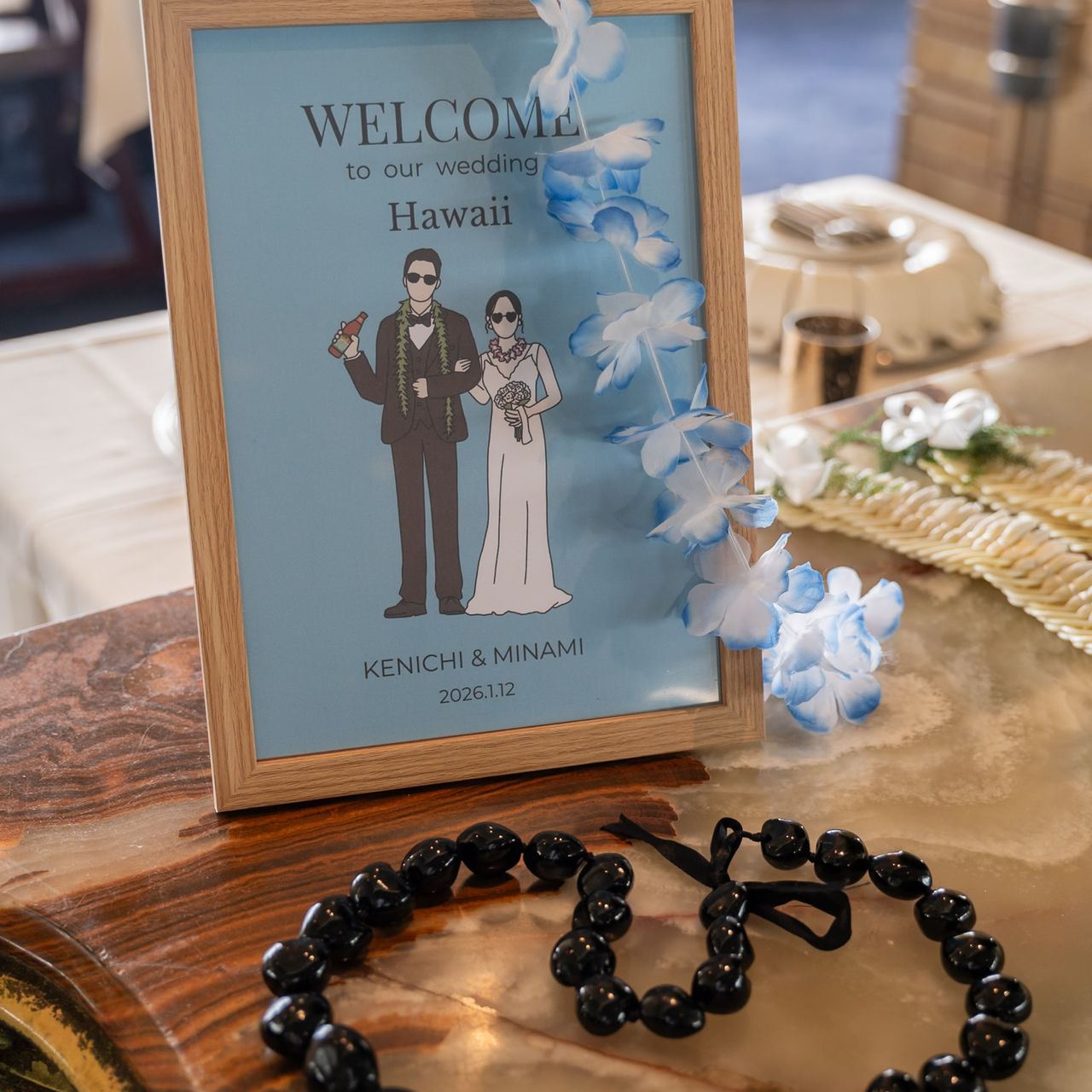 両親以外のゲストの皆さんには、負担にならず日本にも持ち帰ってもらえるよう造花のレイを用意しました。