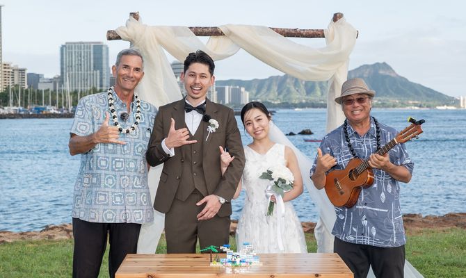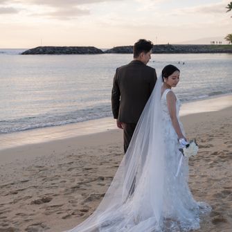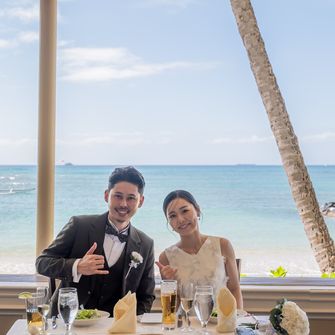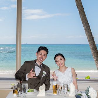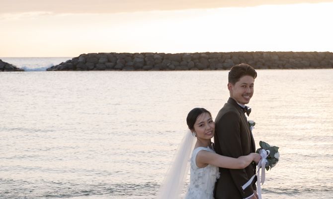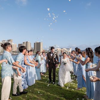 初めて行った海外が、家族旅行で訪れたハワイ。そんな思い出の場所で結婚式を挙げることができました。水色をテーマカラーにし、ゲストのみなさんにもドレスコードを水色でお願いしました。