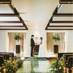 横浜みなとみらいでは珍しい、【緑・水・光】が溢れるガラス張りのチャペル!お二人の背景には緑が広がり、自然の光がお二人を照らす神秘的な教会。祭壇に流れる滝を眺めながら胸に刻まれる感動の誓いを体験できる。