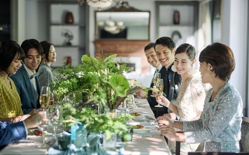 優しい光に彩られたガーデンを眺めながら、本格フレンチを囲んで過ごす幸せな時間。気心の知れた家族とふたりの幼い頃の想い出話を交えながら笑顔あふれるひとときを。