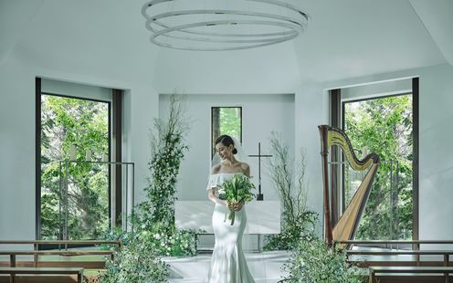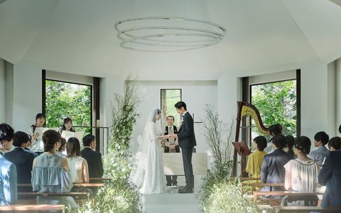 天井から差込む陽光と、窓から見える緑に囲まれた透明感あふれる空間。グランドハープの生演奏が鳴り響く中で行う厳粛な挙式。挙式後は軽井沢の自然に包まれた青空のもと、フラワーシャワーやブーケトス、ゲストからの「おめでとう」という祝福の声と拍手がふたりにふり注ぎます。「乾杯!」の掛け声がかかれば、挙式中、緊張の面持ちだったふたりも自然と笑顔に。ウエルカムパーティからゲストと寛ぎのひとときをお愉しみいただけます。また、美しい緑のガーデンでは海外映画のワンシーンのようなガーデン挙式も叶います。