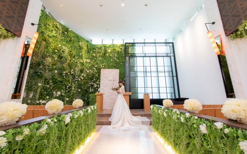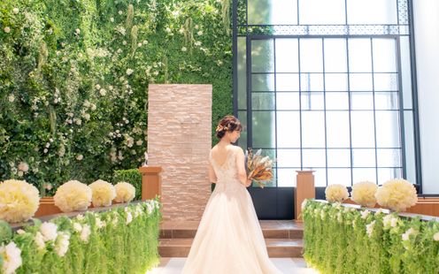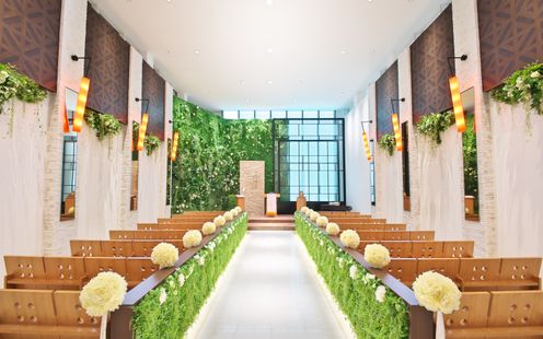 「光り輝く」をコンセプトに、木の温もりとグリーンがあしらわれたチャペル《カナホール》。正面の大きな窓からは自然光が差し込み、明るい雰囲気。バージンロードの両サイドから光が放たれ、花嫁姿をより一層美しく見せてくれます。