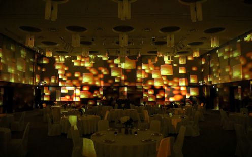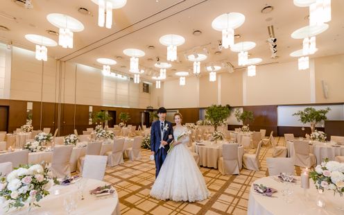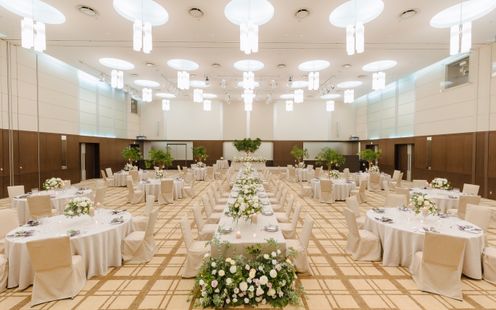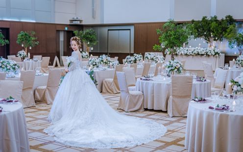 天井高6.5mを誇るメインバンケット《マリンホール》。360度全方位型プロジェクションマッピングが魅力の空間で会場全体をふたりらしく彩ります。衣装や入場曲に合わせて会場の雰囲気を自在に変えられます。