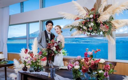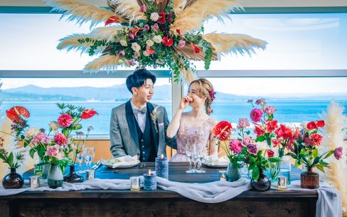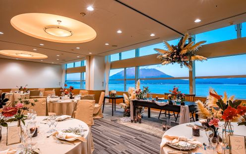 ゲストとの距離の近いアットホームなパーティにおすすめしたい上質空間《カトレア》は、オーシャンビューの壮大なパノラマが魅力。一面に広がる窓からは、錦江湾と桜島を見渡すことができ、特別感に満ちたひとときをお過ごしいただけます。このほか、家族・親族だけのごく内輪でのパーティを検討しているふたりにはレストラン『マリナテラス』もチェック。《カトレア》同様に、大きな窓から自然光がたっぷり降り注ぐ開放的な空間も用意しておりますので好みの空間をお選びいただけます。