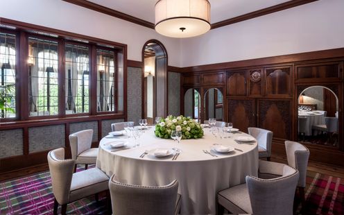 天窓から差し込むやさしい光と、大きな窓から緑豊かな自然を感じられる空間。邸宅の寝室として使われていた個室は、美しい内装や繊細な木彫りが、穏やかな時間に品のある彩りを添えます。併設のサンルームではアフタヌーンティーを愉しむなど、両家の絆が深まる時間に。