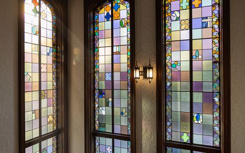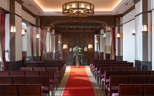 東京都指定有形文化財の本館にある由緒正しい挙式会場です。創建当時の意匠が残る優美な空間は、流行に左右されない本物の格式を感じさせます。高さ3.5mの開放的な天井と、壁一面の大きな窓から差し込む自然光が、重厚な雰囲気に温かさを加え、ゲストとの距離が近いアットホームな誓いの場を演出。親族中心の少人数ウェディングにも最適です。