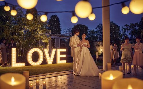 華やかなライトアップ、幻想的なキャンドルライトの揺らめき。ヴィラ・ノッツェ カロー鳥取の自慢のドラマティックなナイトウェディング。パーティ会場から続くプライベート・ガーデンでビュッフェ形式のカジュアルパーティもお愉しみいただけます。