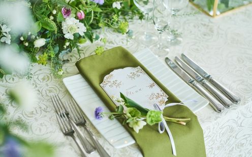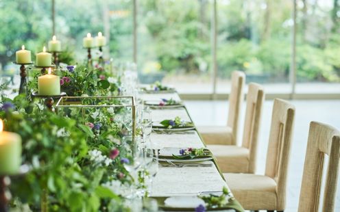 シャンデリアの煌めき、ガーデンの緑を臨む清々しい空間。<ドゥ・リュクス>でゲストをお迎えするのはやさしい自然光とゴージャスな照明が奏でる光のシンフォニーです。空間を彩るテーブルスタイリングはふたりらしい世界観でお創りいたします。