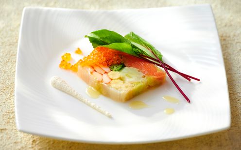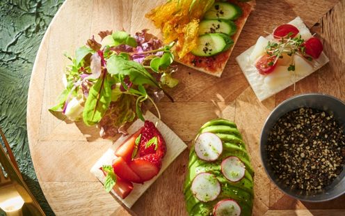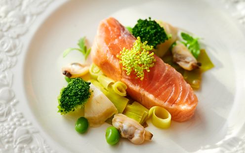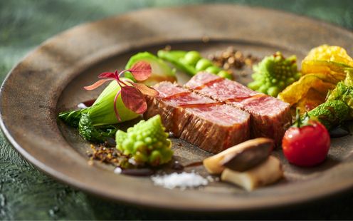 地元の新鮮な魚や旬の食材をふんだんに使って季節感を大切にしたおもてなし。本格派のフレンチシェフがおふたりのご希望を聞きながら、世界でたったひとつのふたりだけのメニューを創り上げます。ふたりにとっての思い出の料理や食材、大事な人が作っているお米や野菜を使ってほしいというリクエストにお話を伺い形ににしていきます。例えば、新郎新婦さまそれぞれのご出身地の特産品でコラボ料理を作ったり、大好きなおじいちゃんが作ったお米でお寿司のウェディングケーキを作ったり。祝福のテーブルを彩るオリジナルメニューにも対応いたします。