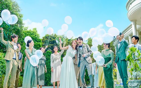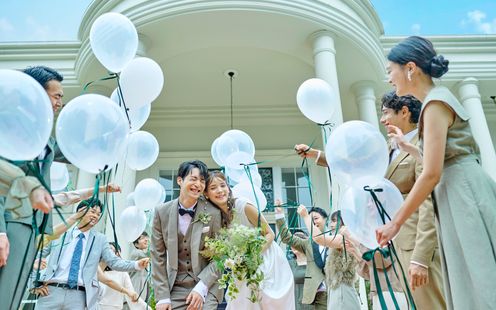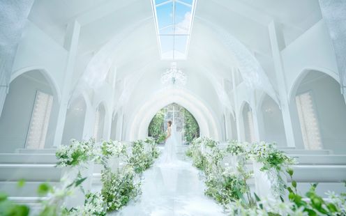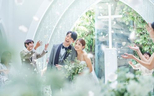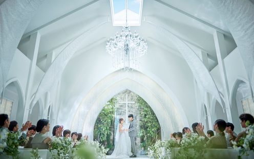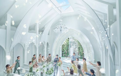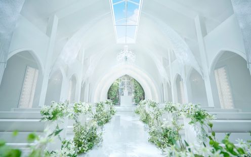 天窓からの光と祭壇奥に彩られたグリーンが美しく調和する純白チャペルは、天井高13m・バージンロード10mの開放感あふれる空間。挙式後はプライベートガーデンでフラワーシャワーはもちろん、ブーケトスやバルーンリリースなどの多彩なアフターセレモニーをお楽しみいただけます。