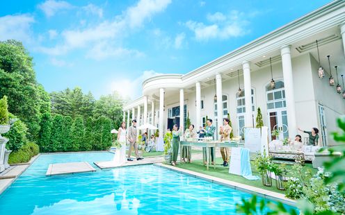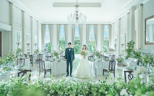 窓の向こうはプール付きのガーデンが広がり、自然を身近に感じながら過ごすことができます。天井が高いのでとても開放感があり、背の高い装花やライブ感あふれる演出も映えるのが魅力。白くシンプルな空間なのでどんなイメージもカタチにしやすく、コーディネートを思いのままに楽しむことができます。人数やスタイルに合わせたレイアウトが可能です。