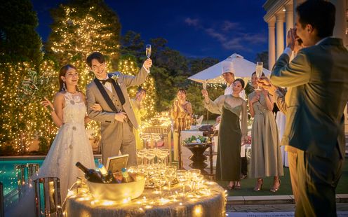プール付きガーデンもふたりのアイデア次第で自由なウエディングステージに早変わり♪挙式後にフラワーシャワーやブーケトス、バルーンリリースなどのアフターセレモニーや、祝宴前のウエルカムパーティ、そしてパーティの中ではフォトブースを設置して記念撮影を楽しんだり、ナイトタイムにはカクテルパーティを行ったりしてふたりらしい演出をちりばめてみては!専属プランナーがふたりの希望にそって外国映画のワンシーンのようなオシャレなパーティを提案いたします。
