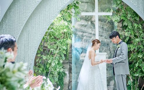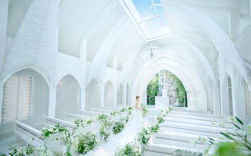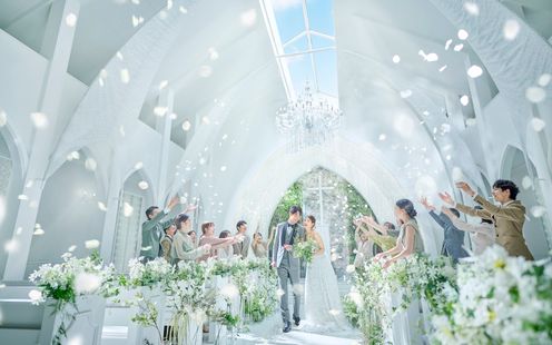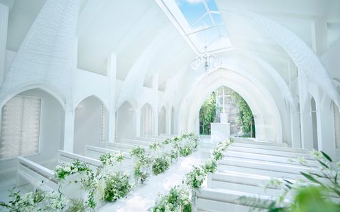 天窓からの光と祭壇奥に彩られたグリーンが美しく調和する純白チャペルは、天井高13m・バージンロード10mの開放感あふれる空間。挙式後はプライベートガーデンでフラワーシャワーはもちろん、ブーケトスやバルーンリリースなどの多彩なアフターセレモニーをお楽しみいただけます。