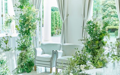 専属のフラワーコーディネーターが、トレンドの知識を活かしながら、ふたりらしさを最大限に表現いたします。数多くのパーティを手掛けてきたスタッフが、ふたりの気持ちを形にします。ペーパーアイテム、トーション、ショープレートなど、すべてを憧れイメージにセレクトいたしますので気軽に相談ください。また、一軒家を貸切なのでエントランスからガーデン、会場までふたりが憧れるテーマでフルオーダーの会場コーディネートも可能です。