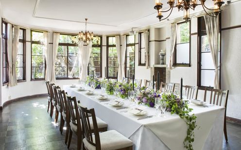 普段はレストランとして使用される、心地よい雰囲気の披露宴会場。前面の大きな窓から柔らかな光が差し込み、家族ご親戚との温かなひとときを演出します。もともとは貴賓室として特別な方々を迎えるための空間だったこのお部屋は、親族のみの会食や少人数の披露宴に最適。自然と会話が弾み、和やかに食事を楽しめるアットホームな祝宴を叶えます。