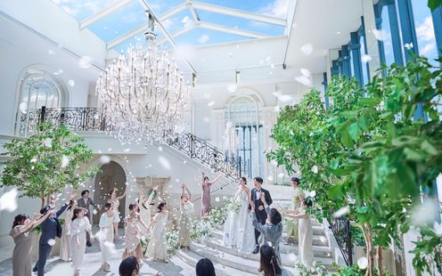 天井高11m、ロイヤルブルーのバージンロードは長さ22m。英国から受け継いだアンティークの美しいステンドグラスやパイプオルガンがふたりの誓いの瞬間を見守る人気の大聖堂。天井はゆるやかにアーチを描き、まるでヨーロッパに息づく教会を彷彿させます。この聖なる空間ではかけがえのない「家族の絆」を大切にした、オリジナルセレモニーが叶います。挙式後は、青空を望む全天候型アトリウムでゲストの歓声と喝采に包まれながらのフラワーシャワーをお愉しみいただけます。