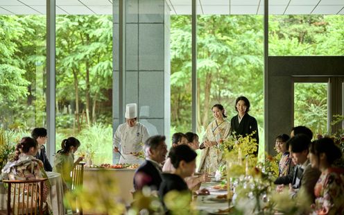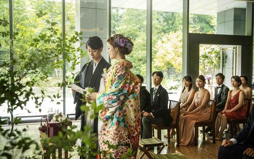 大きな窓から見える緑を背景にオリジナルの和モダン挙式