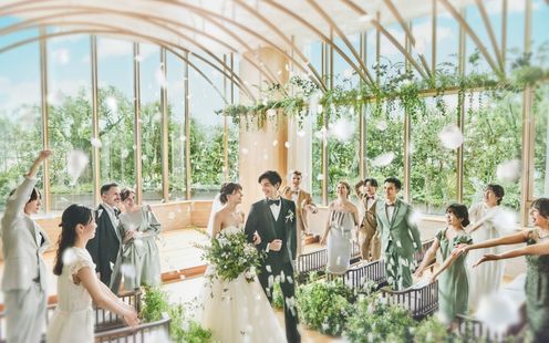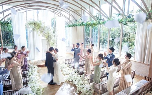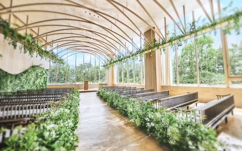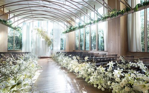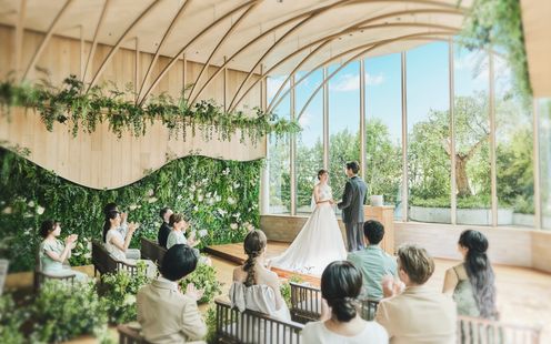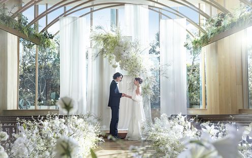 瀟洒なセレモニースペースは枝葉をイメージしたアーチ天井が特徴。2面の大きな窓からはまぶしいほどの自然光が注ぎ込み、光と緑に包まれた温かな挙式空間となっている。