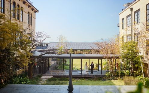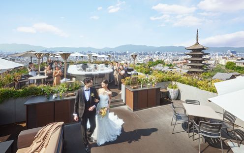 自然光と東山の情景を望むガラス張りのダイニング。東山の豊かな自然と京都ならではの趣きを感じる空間のなか、披露宴の始まりには八坂の塔を背景にしたセレモニーも叶います。