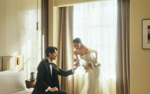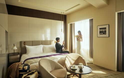 ウエディングの余韻に浸りながら過ごすのは、東山の静けさに包まれたヘリテージホテル「ザ・ホテル青龍 京都清水」。歴史ある建物を丁寧に継承した空間は、凛とした気配とやわらかな灯りに満ち、ふたりの心を静かにととのえてくれます。客室に広がる夜景を眺めながら、笑顔をくれたゲスト一人ひとりの顔を思い出す。今日という日がどれほど幸せな一日だったかを、改めて胸に刻むような夜がここにあります。