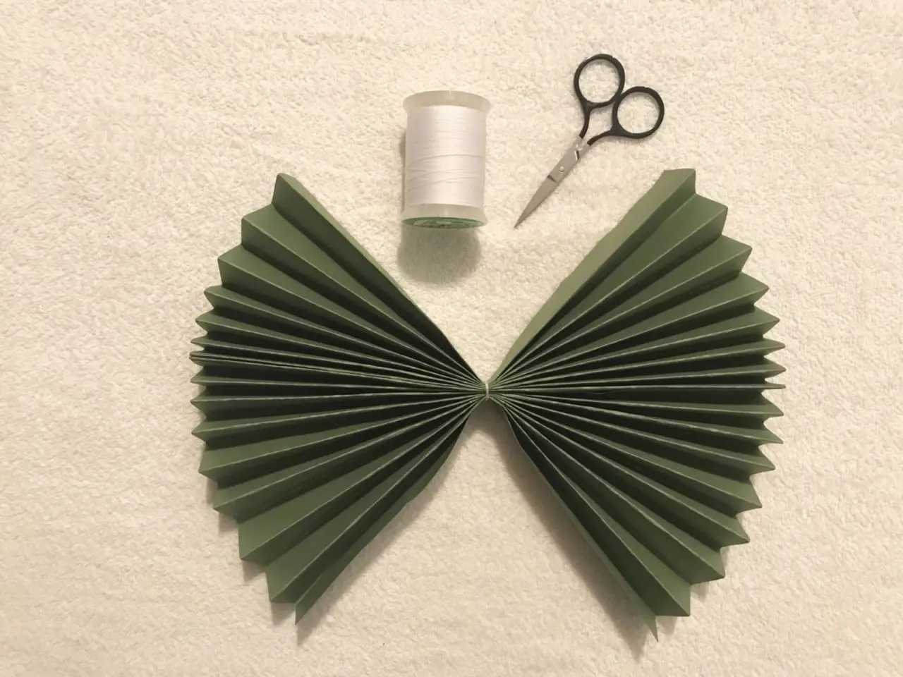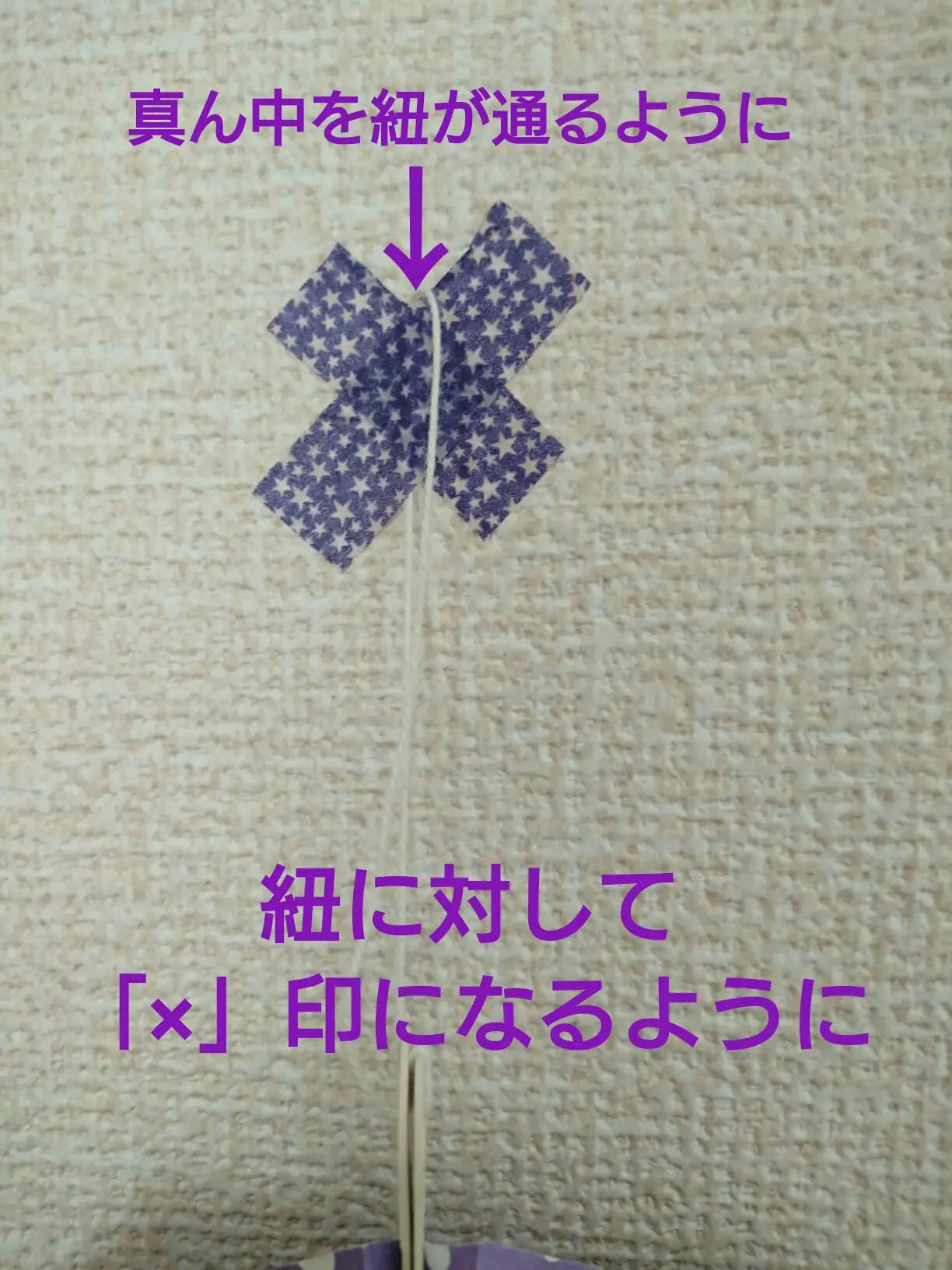 ②中央を糸でむすび、蛇腹の端の一辺を両面テープで貼り合わせる