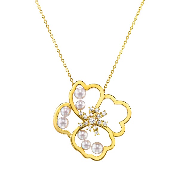 角をモチーフにした洗練されているペンダント。パールとイエローゴールドの輝きが融合し印象的なデザインが魅力的。