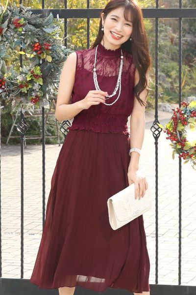 レースがあしらわれていているボリュームのあるスリーブが印象的なパーティードレスコーデです。マットなボルドーカラーで存在感のあるデザイン。パールカラーのバッグやパンプスをあわせることで全体的に明るさがプラスされます。