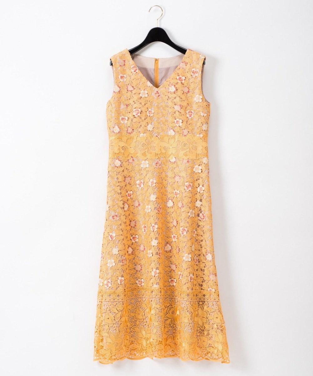 花柄レースを使用した美しい膝丈パーティードレスです。イエローのボディに白とピンクの花が散らばっていて華やか。暑い時期の結婚式でも涼しげに見せられます♡