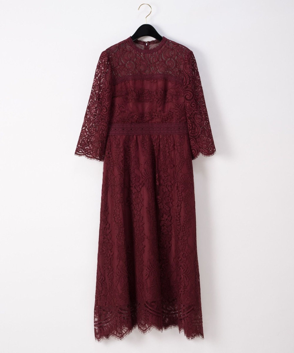 美しいボルドーカラーのパーティードレスです。華やかな総レースでハイネックデザインがクラシカルな印象。ウエストから切り返しになっていて、すらりとしたフォルムが素敵です♪