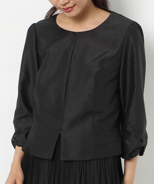 ボレロよりも少し丈が長めのスタイリッシュなノーカラージャケットは、結婚式以外にもあらゆるフォーマルシーンで着回しができる1枚。