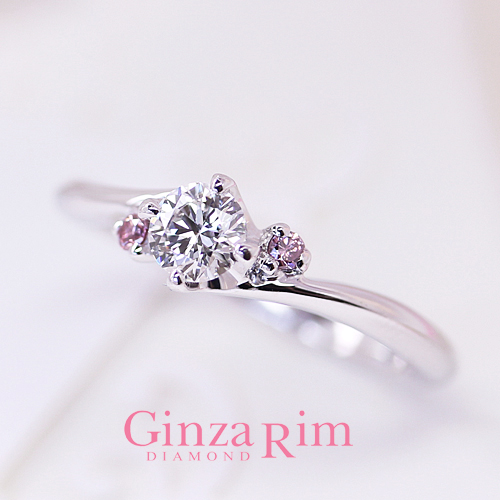大きいセンターのダイヤモンドが特別な輝きを放ち、サイドのピンクダイヤモンドがフェミニンさをプラス。ストレートラインの指輪なので、結婚指輪とも重ねづけしやすいのもおすすめポイントです。