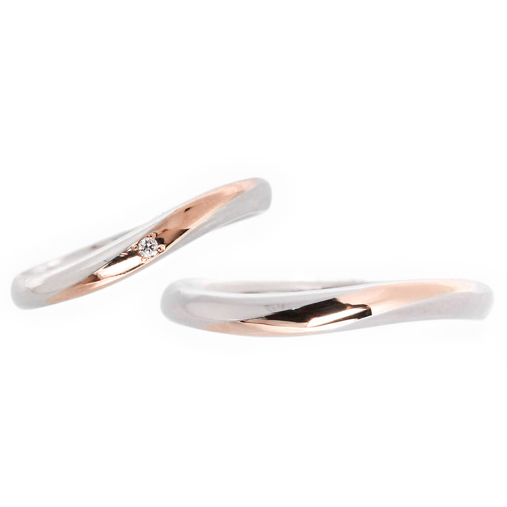 ピンクゴールドとプラチナ素材のコンビデザインの結婚指輪です。シンプルですが、素材が絡み合ったような流れるデザインが上品な印象。女性用には小さいダイヤモンドを1石埋め込んでいます。