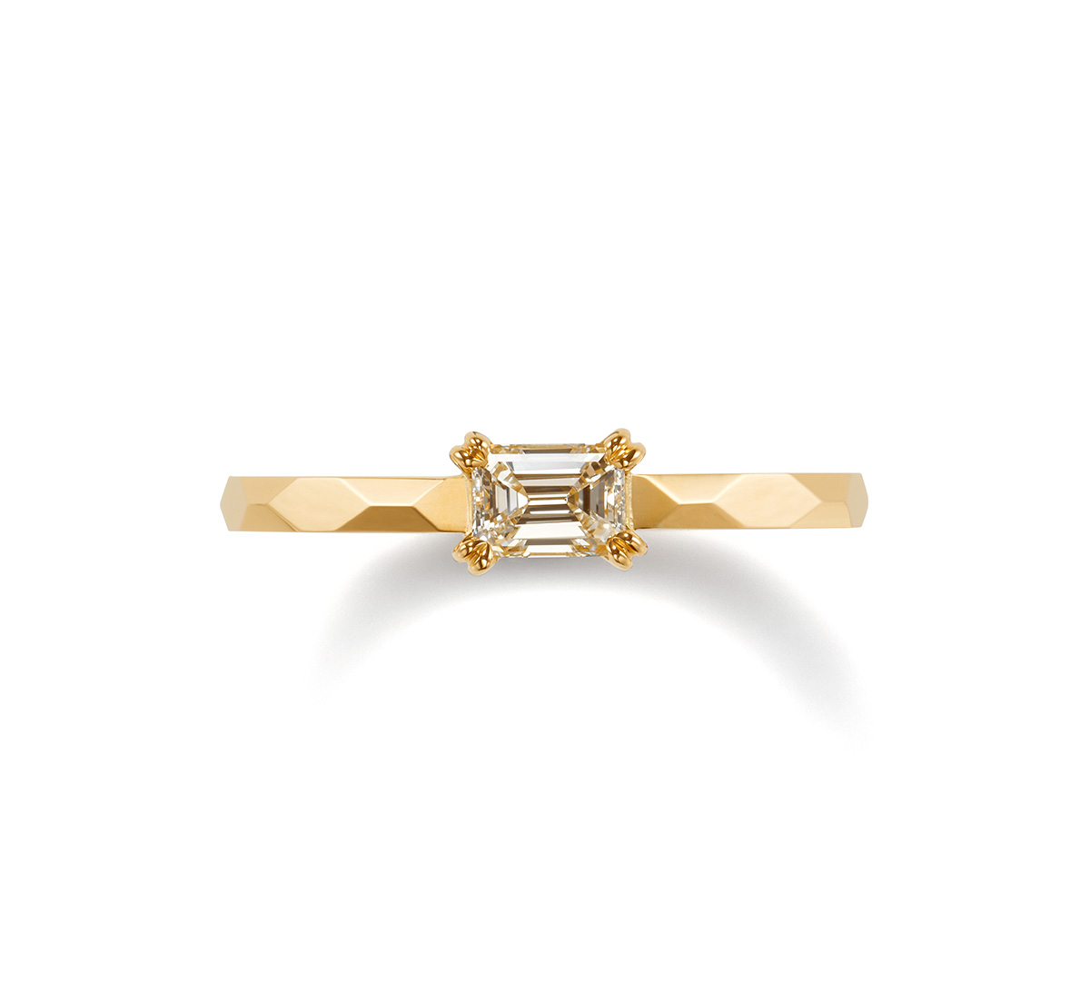 エメラルドカットのダイヤモンドを1石センターにセッティングした華やかな婚約指輪です。多面体カットのストレートリングがゴージャスな印象。ゴールド素材を使用していて、カジュアルなファッションにも馴染みます。