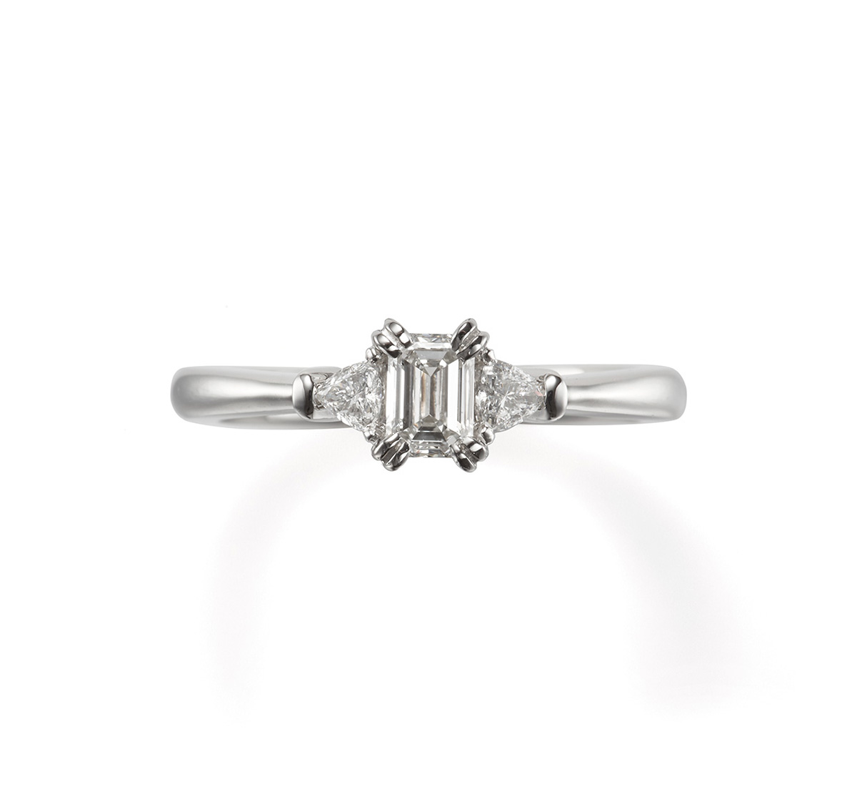 エメラルドカットの魅力を活かした婚約指輪です。3石のダイヤモンドを贅沢にセッティング。縦にセッティングされたダイヤモンドはうっとりするほど上品な輝きを放ちます♪