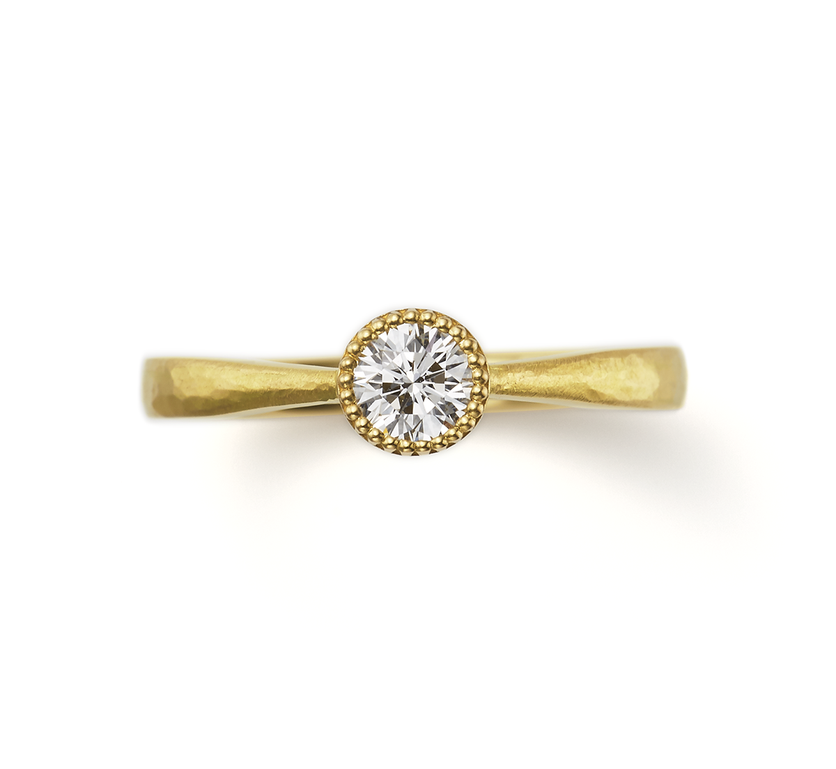 また、センターのダイヤモンドの周りにミル打ちを施し、アームはハンマー仕上げでマットな質感でカジュアルな雰囲気もあわせ持っていますよ♪