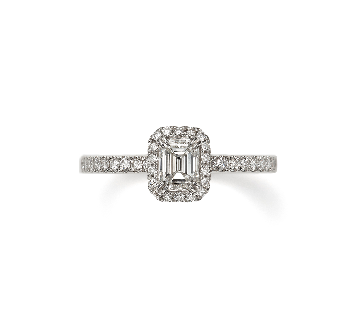 ダイヤモンドの贅沢な輝きを身にまとえる婚約指輪です。エメラルドカットのダイヤの周りにはメレダイヤモンドをセッティングしていて目を引きます。