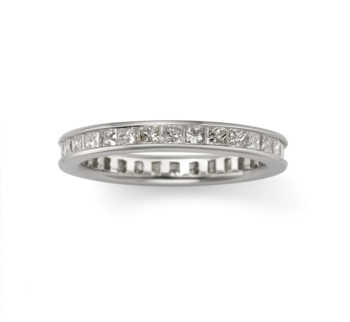 プリンセスカットのダイヤモンドをセッティングした可憐な印象のエタニティリングです。隙間なく敷き詰めていてゴージャス。愛を込めて贈る指輪にぴったりですよ♡