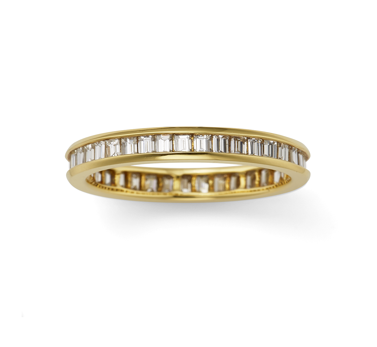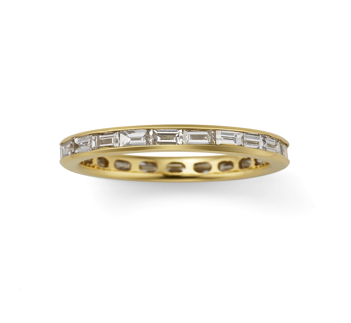 バゲットカットダイヤモンドの美しさを感じるエタニティリングです。ダイヤモンドがゴールドのアームに敷き詰められていて魅力的な輝きを放ちます。派手すぎないデザインなのでシンプルな指輪と重ねあわせて楽しめますよ♪