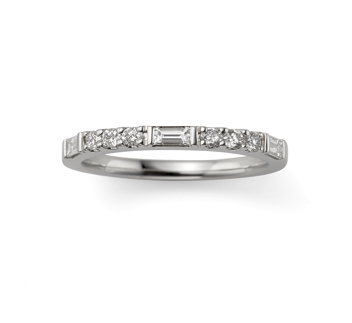 バゲットカットとラウンドカットのダイヤモンドをバランスよくセッティング。手元にダイヤモンドの輝きを贅沢にまとえるデザインが魅力的です。婚約指輪を兼ねた結婚指輪としてもおすすめ♡